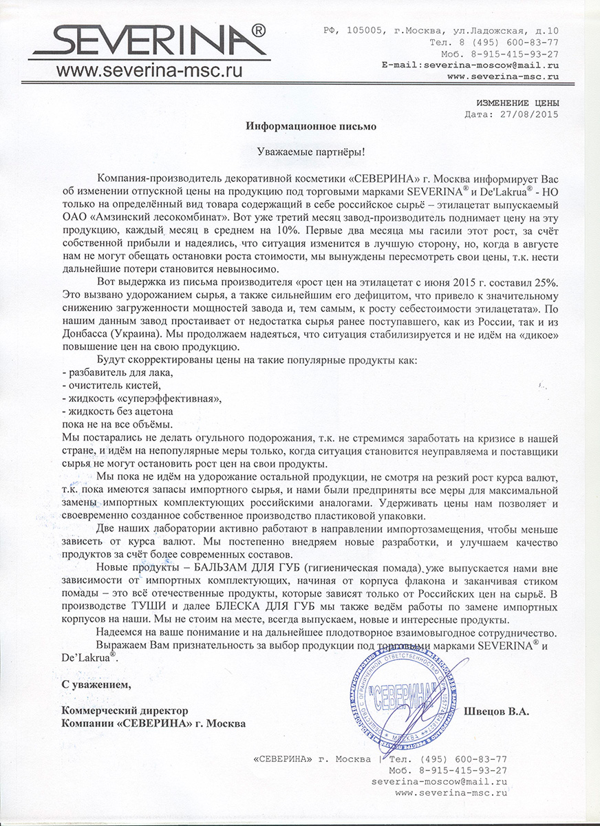 Повышение цен Severina